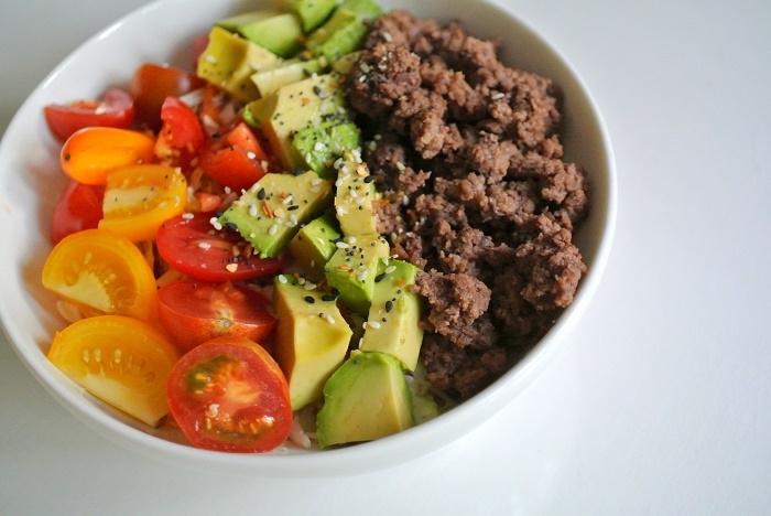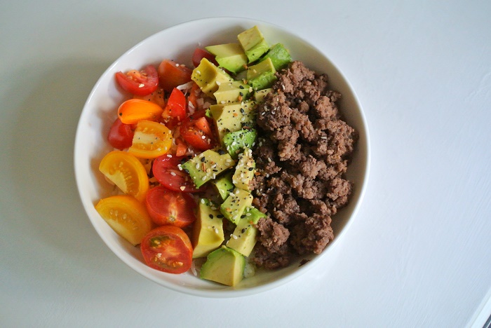 My dad actually introduced me to this concept of a meal (not a recipe, really) when he served it to us for lunch on a recent weekend at the lake. I just cook some grass-fed ground beef with a little soy sauce and plop it in a bowl with shredded cabbage, tomatoes, and avocado. This particular rendition featured some heirloom tomatoes–aren’t they pretty?! As a bonus, this meals comes together in less than 10 minutes.