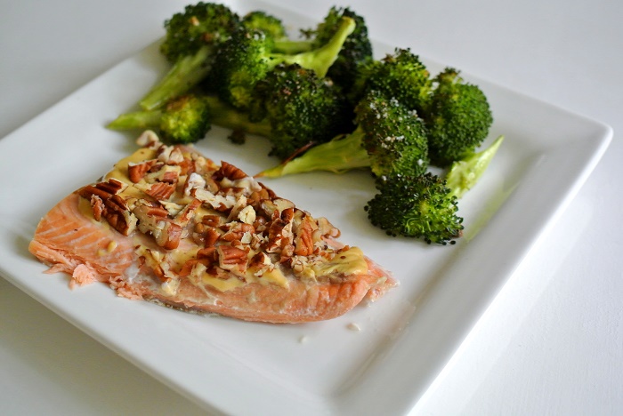 I might have been inspired to make this dish by something on Pinterest, but I honestly don’t remember. Let’s just say it’s a Broccoli Hut original. I mixed some Dijon mustard with some Lemonaise, spread it on some salmon, and packed on some chopped pecans. I love this combination of flavors, plus the mustard/mayo mixture keeps the fish quite…moist (sorry, I know that word is upsetting for some people). I might try playing around with other nuts/seeds as the topping in the future.