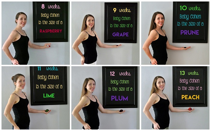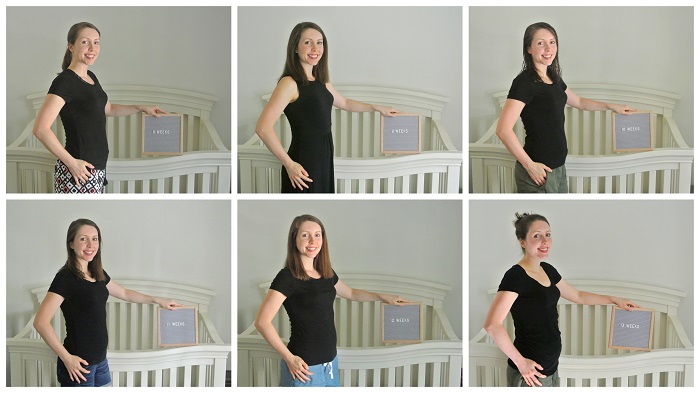 I’ve been taking bump photos since week 8. In collage form, it’s difficult to read the letter board, so I’ll just tell you that the top row is weeks 8-10; the bottom row is weeks 11-13.