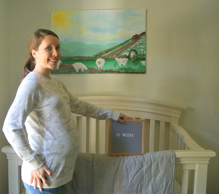Week 34: OK, I think I’m entering the uncomfortably large stage of pregnancy. Sitting in a chair has ceased to be comfortable; I much prefer to be reclined on the couch or our bed these days. The trouble is, my entitled toddler often somehow takes up the entire couch, which irks me…a lot. Did I mention that I’m a little irritable these days?