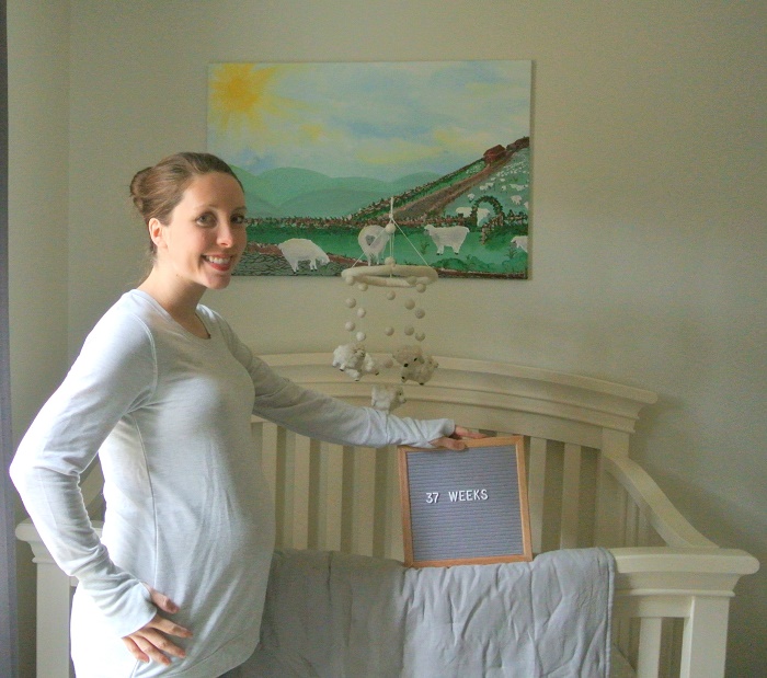 Week 37: Yay for making it to term! I have finished up most of my duties at school/work (including turning in my finalized dissertation!), so I am now turning my attention to Christmas and baby preparations. I’ve started having leg cramps several times per day, but I’ve been kinda slacking on taking my Natural Calm magnesium supplement every night, so that could be an easy fix. Otherwise, I feel good–I’m getting plenty of sleep, and I’m still exercising each morning.