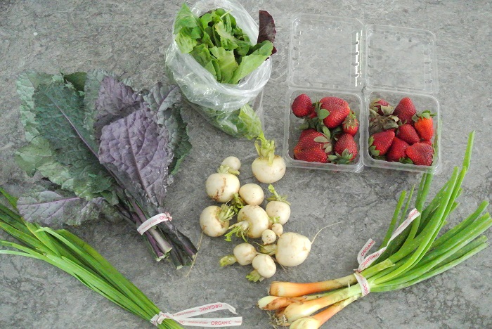 Happy Friday! Just popping in quickly to share another CSA haul. I must have been in a rush when I took the photo below, as it’s a little blurry. Nonetheless, you get the idea of what we received in our box this week: