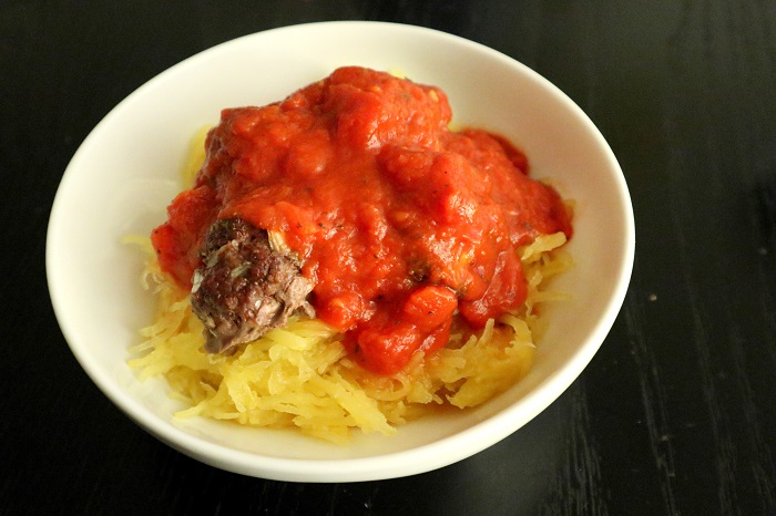 As part of my ongoing research duties, I help teach a weight loss class on Tuesday evenings until about 8pm, so Seth is in charge of dinner on those nights. I typically choose the recipe and will occasionally prepare some or all of it ahead of time to streamline things. On this occasion, I made the meatballs in the afternoon so that he just had to roast the squash and add some jarred pasta sauce. For the meatballs, I just use roughly the same ingredients as my meatloaf (described here). This was amazingly tasty and satisfying, although it probably helps that I’m starving by the time 8pm rolls around. Hunger is the best sauce, as they say!