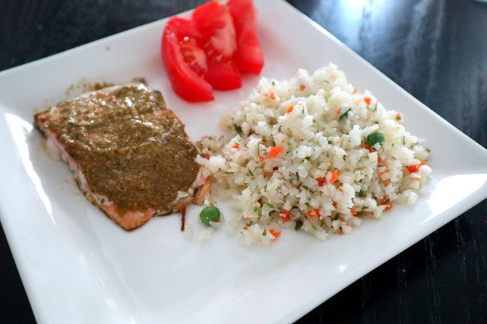Admittedly, this meal did not photograph very well, but that’s real life. I’m not sure why the pesto looks brown in these photos, but it was definitely green. This was kind of a semi-homemade meal in that the salmon and cauliflower rice came from the freezer, and the pesto came from a jar. I’m pretty sure I’m the only one who enjoyed this dinner–I ate seconds on the salmon, whereas the rest of the family filled up on the buttered peas I served as an additional side dish. Caleb continues to claim that he doesn’t like pesto, which I refuse to accept, so I keep serving it to him. He scraped the pesto off and ate about two bites of salmon. Overall, not exactly a home run of a meal.