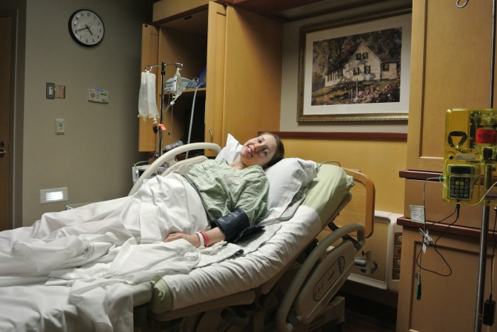 ~2:00 AM I tried to get some sleep after showering, but the mild respite from the pain wore off quickly. With a little coaxing from Seth, I decided that regardless of whether this was labor or something else, I needed to go to a hospital, pronto. Seth called the nurse who was on-call and explained the series of events. She told us to come on in.