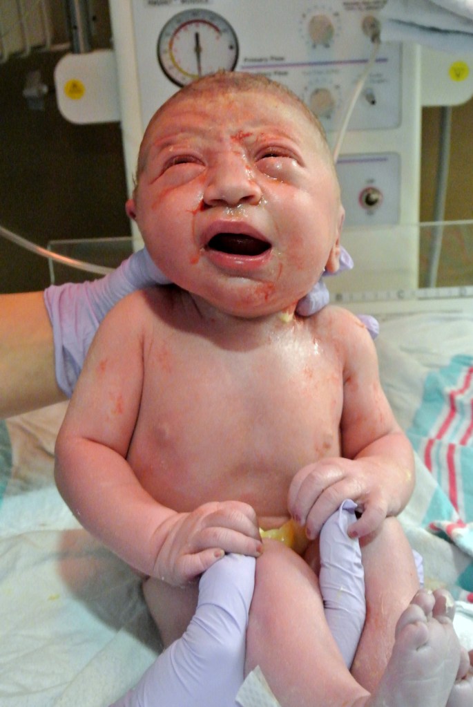~10:55 AM Caleb came screaming into this world. Seth got to cut the umbilical cord (which the nurses described as a “nice, juicy one”–ugh!), and I got to hold my beautiful baby boy, covered as he was in goop. I sobbed tears of joy.